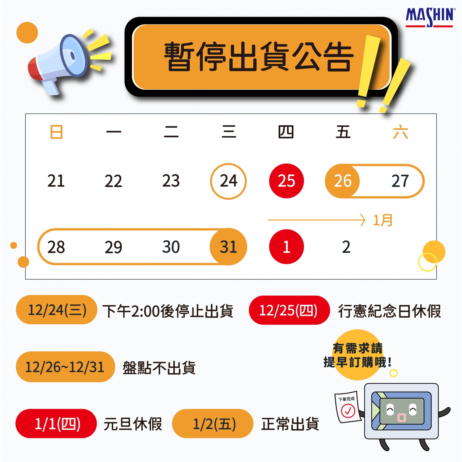 若您有急需的商品,請務必於 12/24(三)下午兩點前完成下單,避免因出貨暫停造成您收貨時間不便。