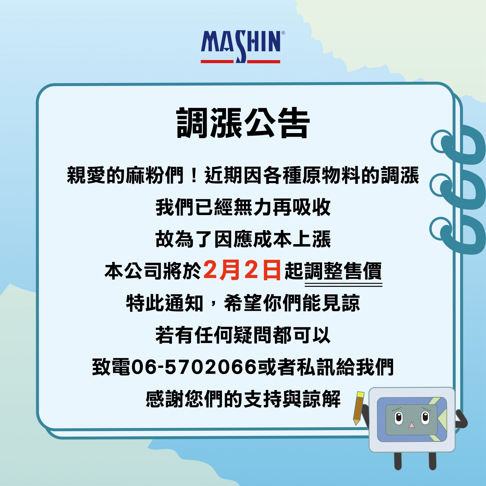 本公司將於【2月2日】起調整售價,