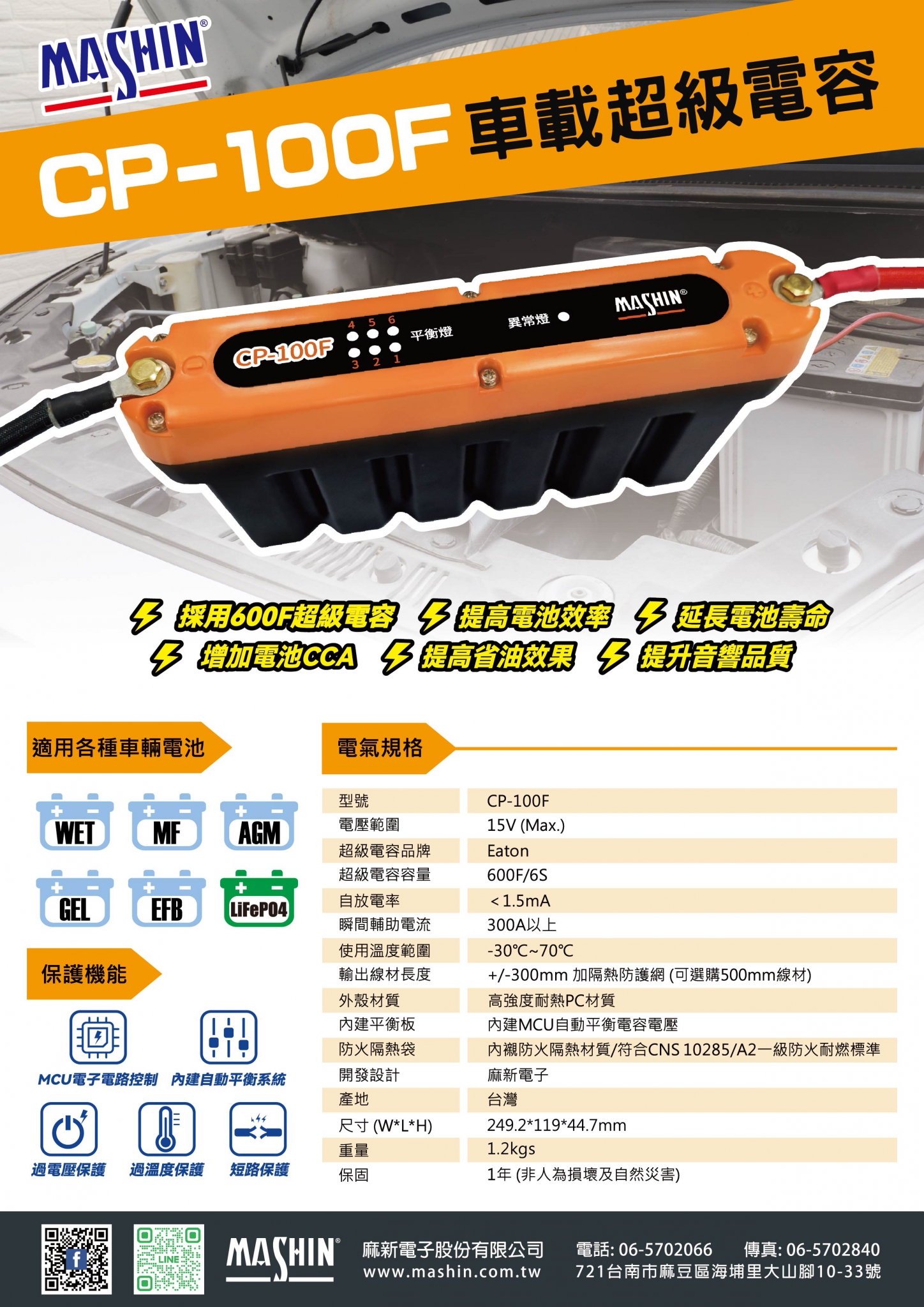 CP-100F主要採用高於市場上同功能的車載超級電容,更大的法拉數(100F),可以提高更有效的提供瞬間啟動電流,並且100法拉的容量對於直流電線路內的雜訊濾波效應更好。在內部設有MCU進行了電容平衡、溫度保護、過電壓保護機能,可以防止各種可能意外狀況的發生。並且採用了防火隔離袋安裝,可以降低引擎室的高溫進入超級電容內導致觸發溫度保護啟動(防火隔離袋符合國家ISO耐燃等級1級並具有防震效能) 。