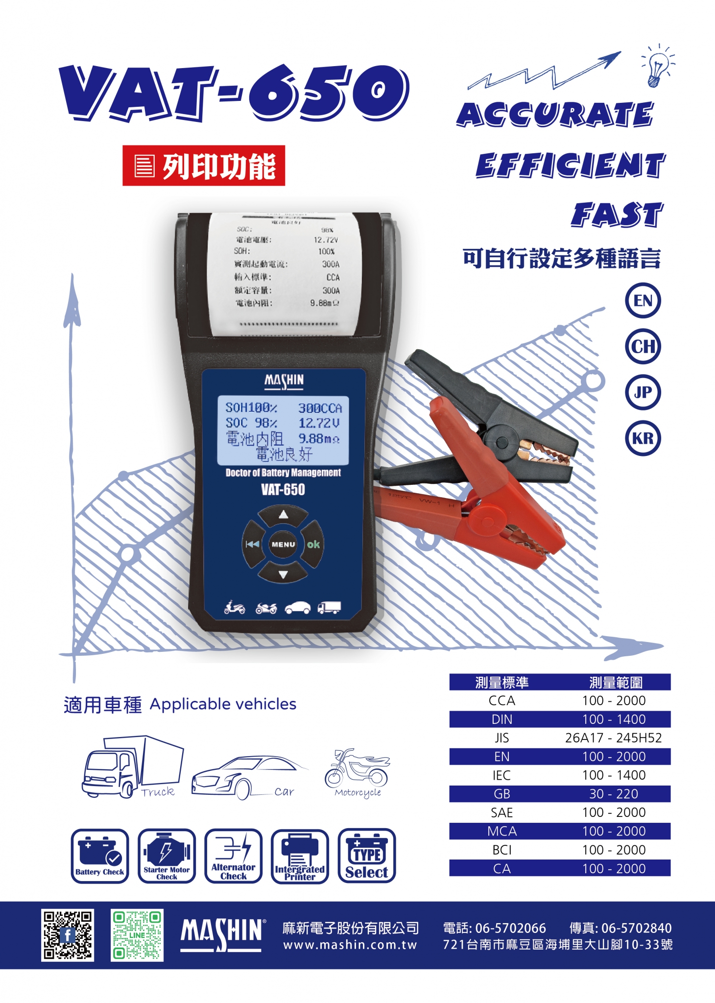| 量測電池種類 | CCA, BCI, CA, MCA, JIS, DIN, IEC, EN, SAE, GB |