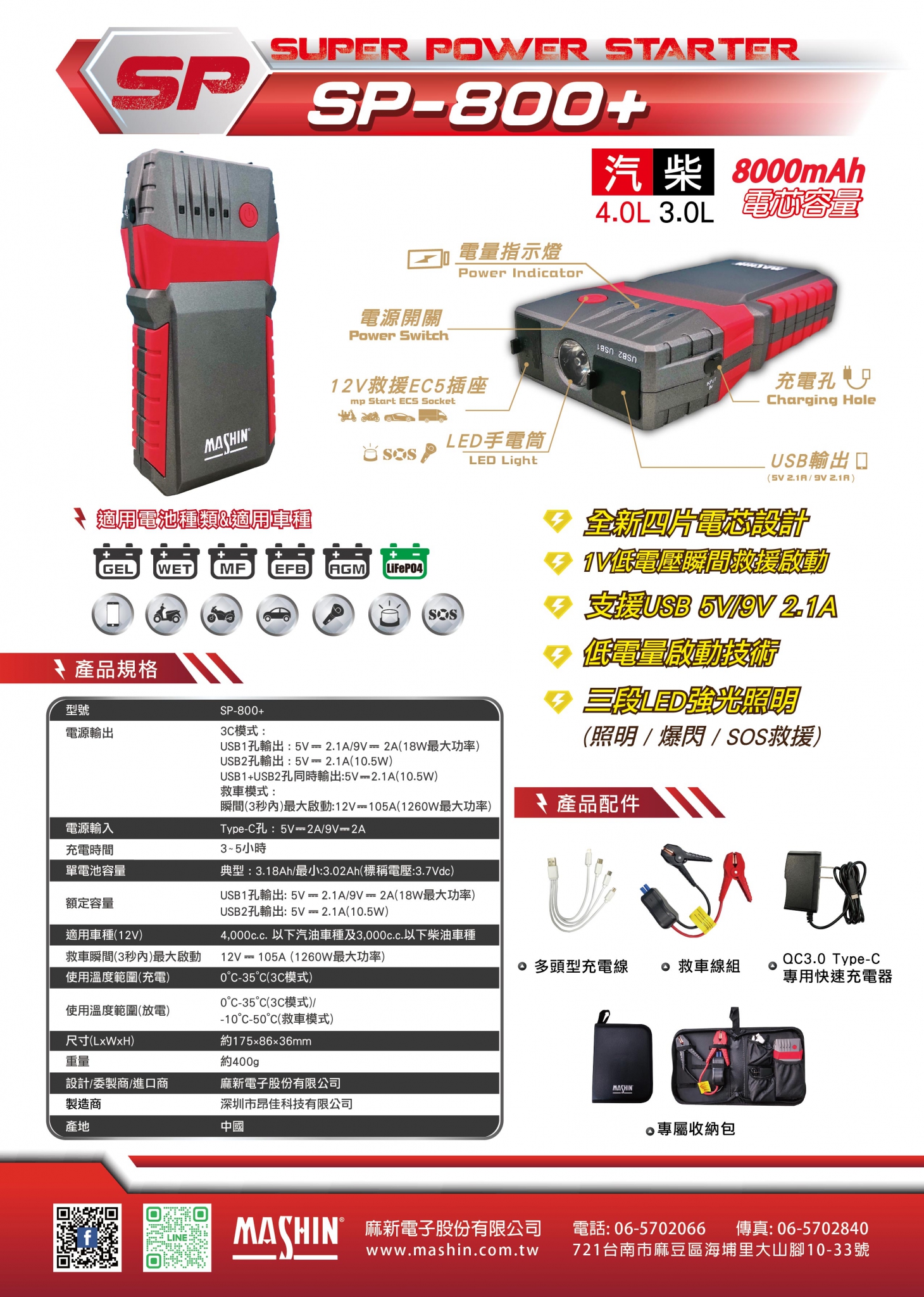 產品配件:救車線組、專用快速充電器、多頭型充電線、專屬收納包